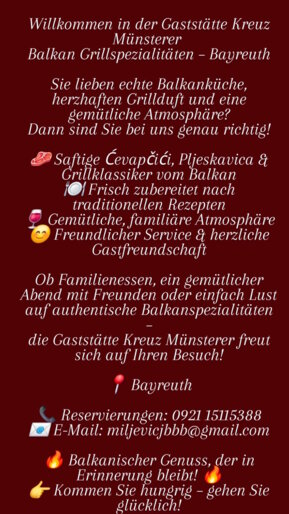 Sie lieben authentische Speisen aus der Balkanküche und schmackhafte Grillgerichte? Dann besuchen Sie die Gaststätte Kreuz Münsterer in Bayreuth-Kreuz!